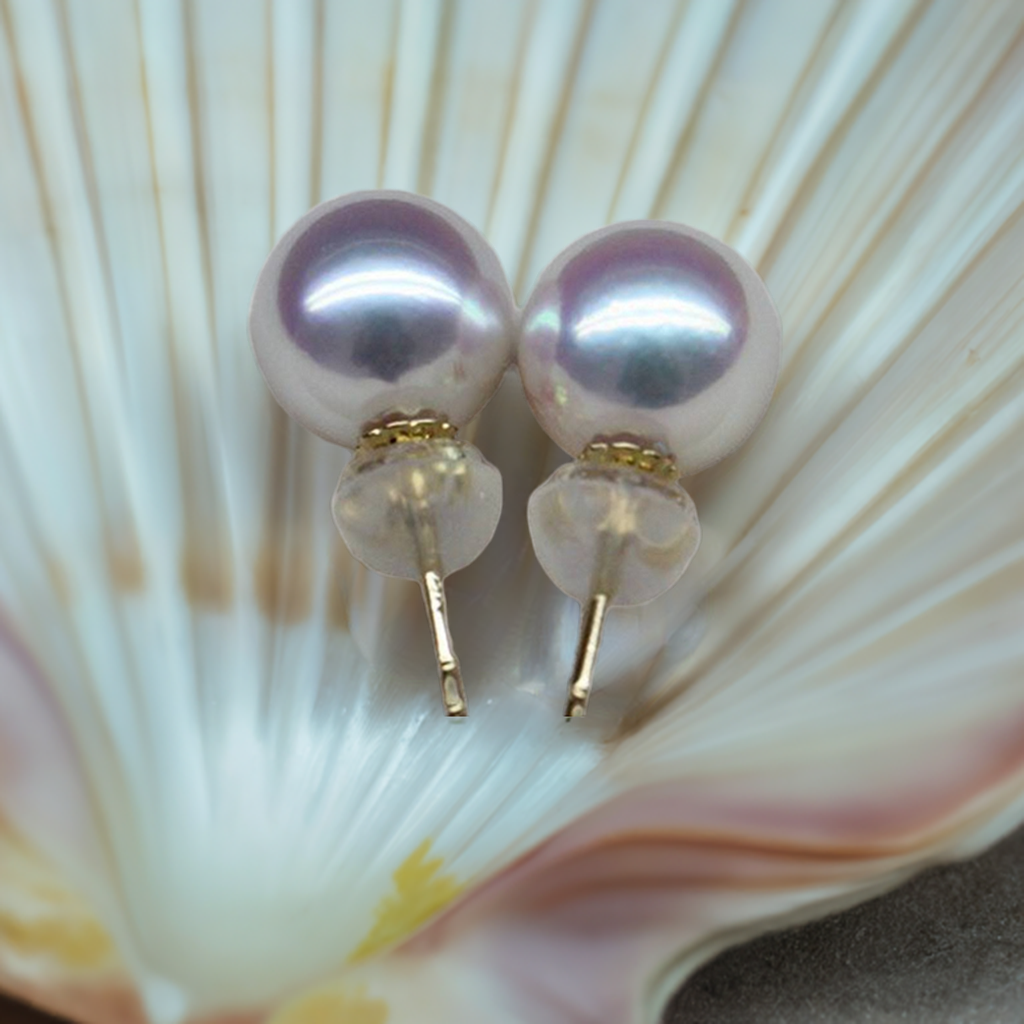 8.0-8.5 mm Japanese Akoya Pearl Stud Earrings with 18K Solid Yellow Gold Post and Back